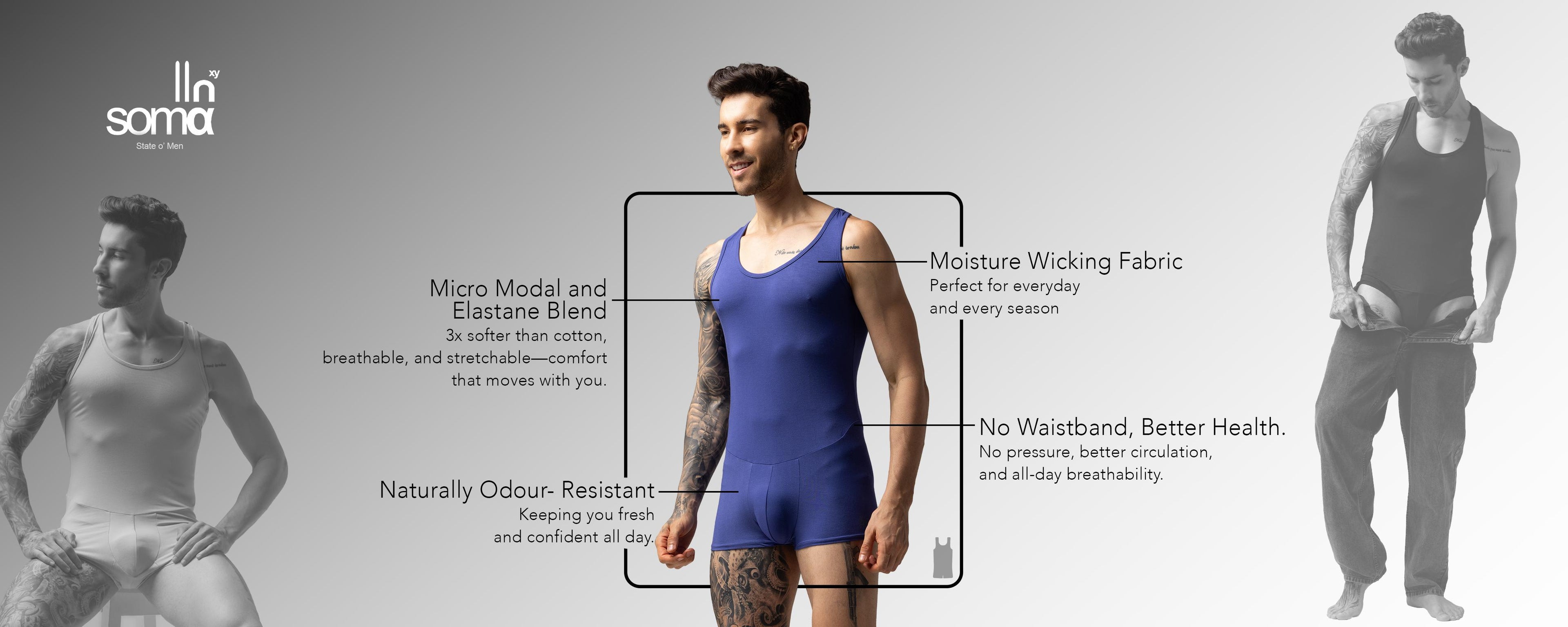 We’re redefining men’s innerwear with innovative designs that move with you, crafted to support your lifestyle, not restrict it. Our signature somasuits are engineered with premium fabrics, ergonomic fits, and thoughtful details that bring freedom, style, and functionality together.